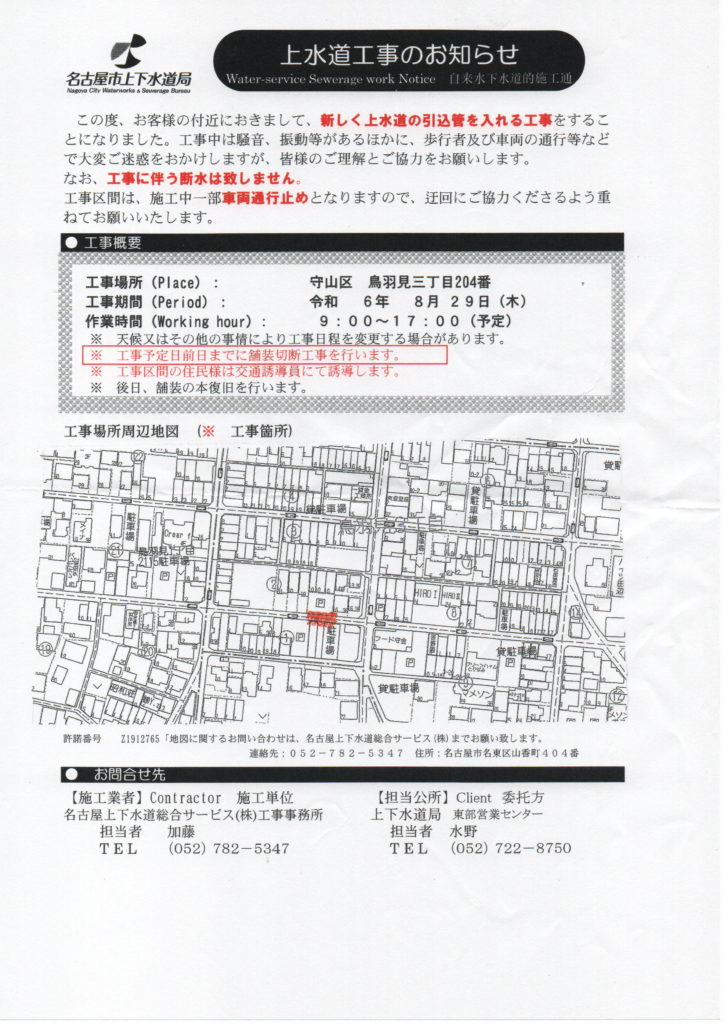 お知らせ! 8月29日(木)9:00~ 当院第2P北側道路で工事が行われます。 南側道路より進入可能ですが、わかり難いと思われますのでわからない場合は交差点付近に駐在する交通誘導員にお尋ね頂くか、院へお電話下さい。