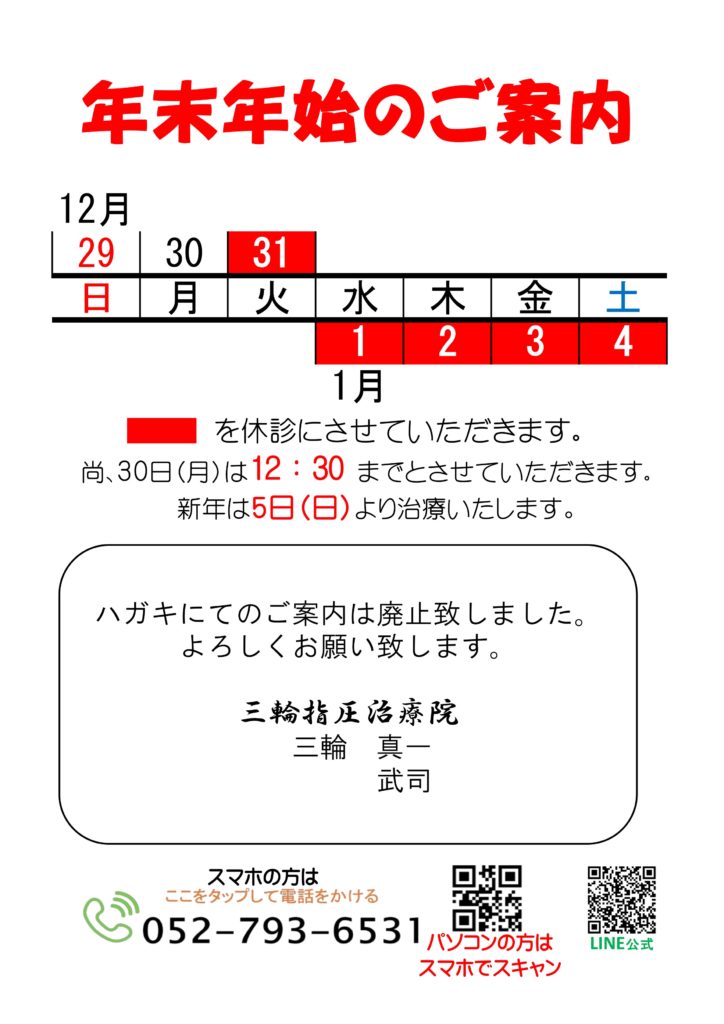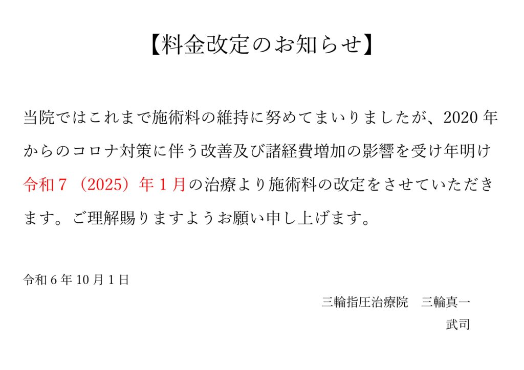 お知らせ! お知らせ!TOP 【重要なお知らせ】 院長が過去の古傷の手術のため 【8月6日(水)~9月いっぱい】 入院しお休みいたします。院は時間通り開いておりますが、突然の変更などあるかも知れませんので予約時などにご確認くださいますようお願いいたします。 また期間中、予約や配信などの不手際があるかも知れませんがご理解のほどよろしくお願いいたします。 2025.7.27 三輪指圧治療院 院長:三輪真一