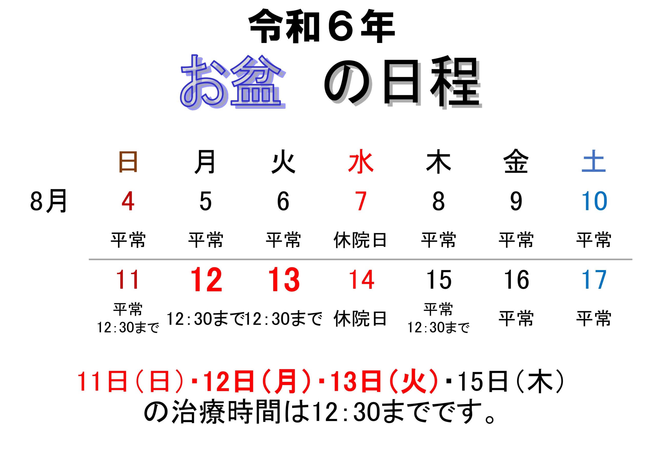 お知らせ! 年末年始・お盆など お盆の日程 上記の通り 11日(金)・ 14日(月)・15日(火)が 12:30までとなります。 混雑が予想されます。 LINE及びお電話にて ご予約・問い合わせをおススメ致します。